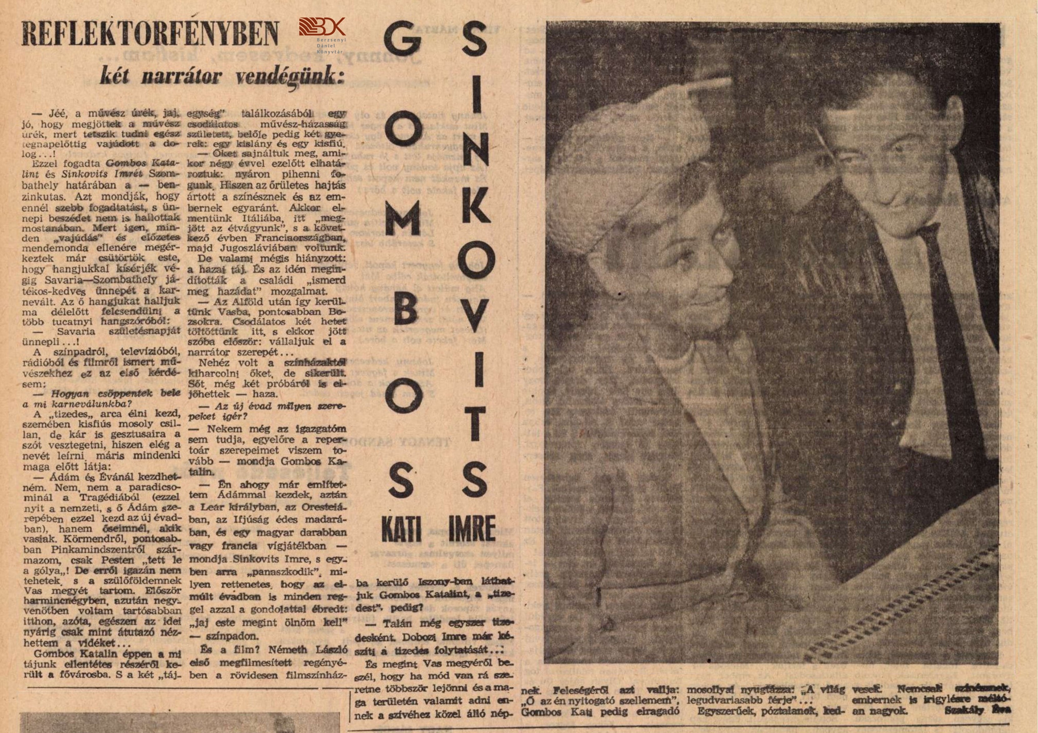 Reflektorfényben két narrátor vendégünk: Gombos Kati, Sinkovits Imre. Vas Népe 1965. aug. 29., 6. o.