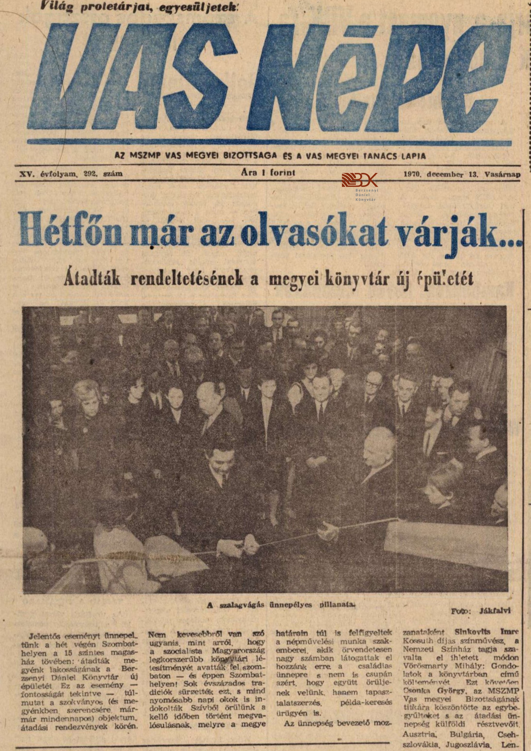 Hétfőn már az olvasókat várják… Átadták rendeltetésének a megyei könyvtár új épületét. Vas Népe1970. dec. 13., 1. o.