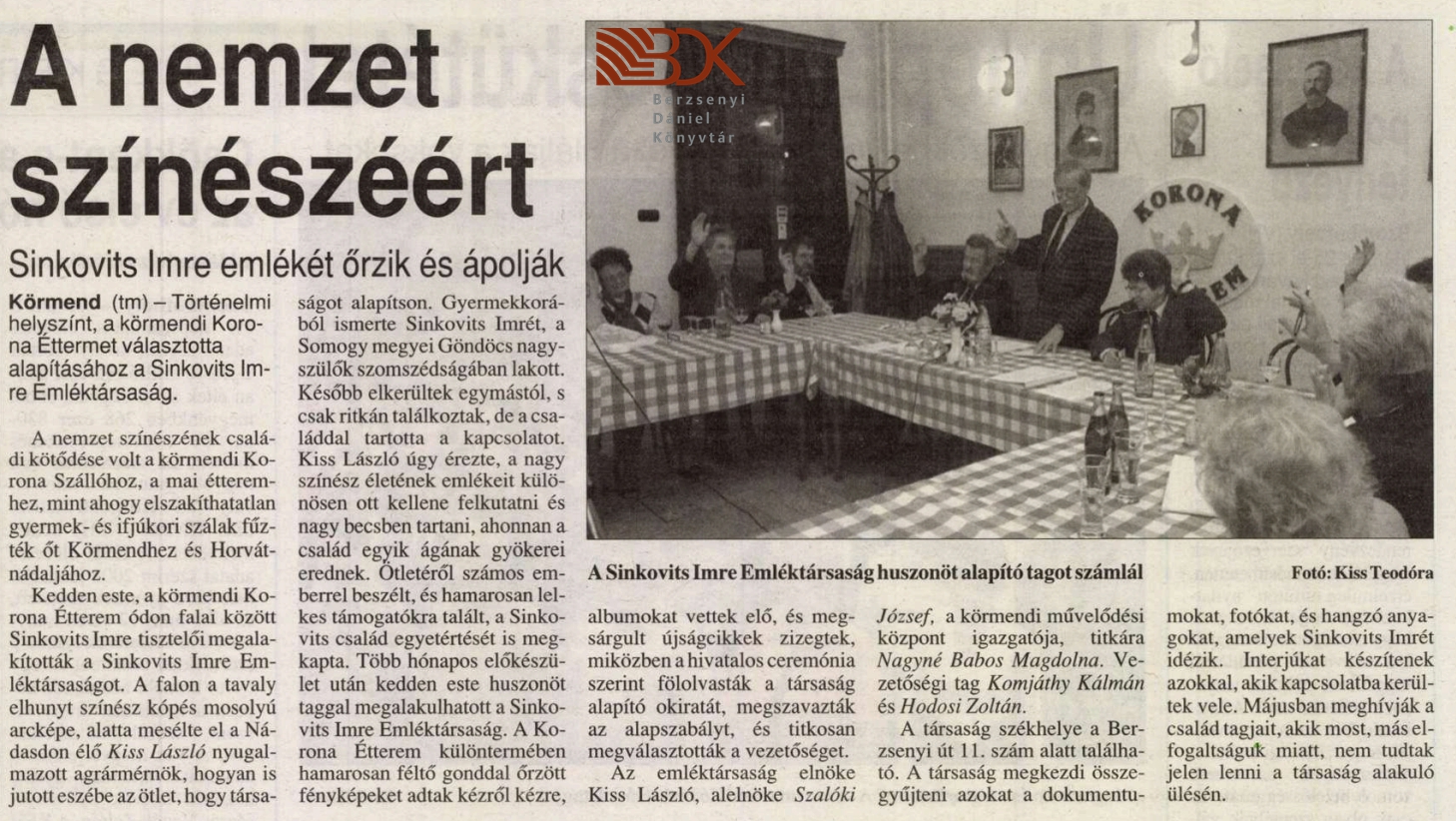 2002-ben, stílusosan, a körmendi Korona Étteremben megalakult a Sinkovits Imre Emléktársaság azzal a céllal, hogy összegyűjtsék azokat a dokumentumokat, fotókat és hangzó anyagokat, amelyek a színművészt idézik, interjúkat készítsenek azokkal, akik ismerték. Emlékesteket szerveztek, az üléseknek helyet adó különtermet pedig Sinkovits-teremnek nevezték el.