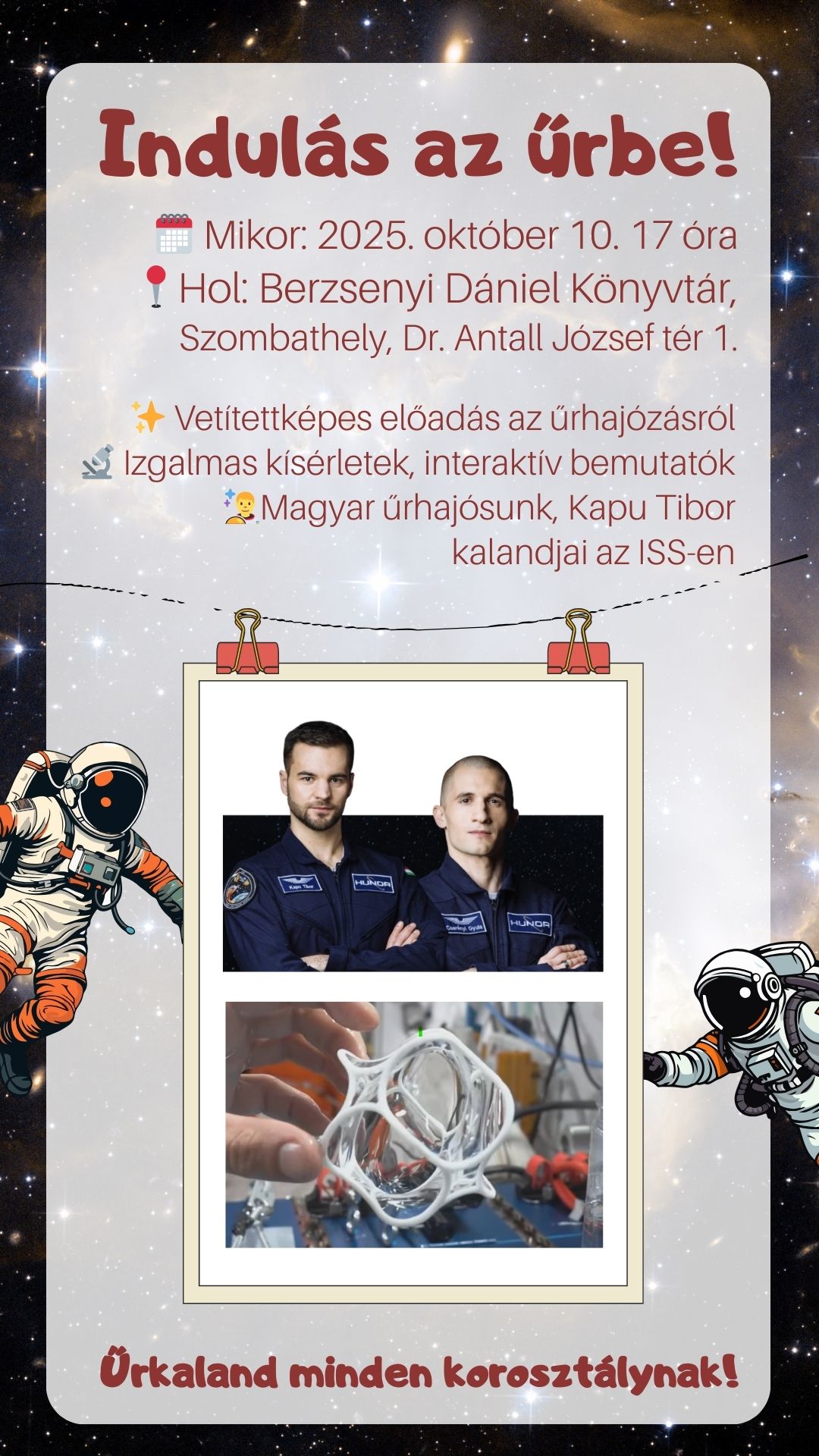 A Magyar Űrkutatás Napja alkalmából szeretettel várjuk az érdeklődőket 2025. október 10-én, 17 órai kezdettel a szombathelyi Berzsenyi Dániel Könyvtárban megrendezendő programunkra.