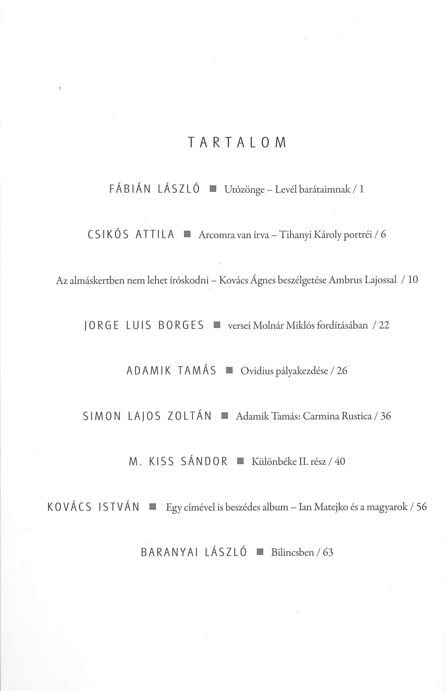 Fábián László író-költő levele gondolkodásra sarkallja az olvasót. Barátainak összegyűjtött gondolatai a kirekesztés, eliminálás témakörében egyfajta javaslat arra vonatkozóan, hogyan válasszák külön a barátságot a politikától. Legyünk toleránsak a kirekesztésben, ám még a toleranciában se legyünk kirekesztők… Az aktuális szám illusztrációit Tihanyi Károly Érzelmeink című kiállításának anyagából válogatták. Ennek kapcsán közlik Csikós Attila író megnyitó szavait, melyek szeptember 8-án a nagykanizsai Hevesi Sándor Művelődési Központban hangzottak el. Kovács Ágnes irodalomtörténész Ambrus Lajos íróval, e lap egykori szerkesztőjével (1983-1993) beszélgetett többek között az Életünk folyóirat sikeres számairól, a szerkesztőség egykori erősnek tartott írói gárdájáról, a Forgó-klubos időkről, kedvenc olvasmányairól, a borról és a poétikáról, alkotásról, gyümölcstermesztésről. Röviden azokról a dolgokról, amikből az ambrusi írói világkép építkezik. Jorge Luis Borges neve mostanában pörög, hisz a Jólfésült menydörgés című összegyűjtött novellás kötete nemrégiben jelent meg a könyvpiacon a Jelenkor kiadó igényes tálalásában. Az argentín író-költő öt versét Molnár Miklós fordításában ismerhetjük meg. Adamik Tamás ismert és elismert irodalomtörténész Ovidius antik római költő hosszúra nyúlt pályaívének kezdeti szakaszát örökíti meg előadásszövegében, mely élőszóban is elhangzott a Salvatore Quasimodo költőversenyen. A kritika rovatot ezúttal Simon Lajos Zoltán könyvismertetője, ajánlója gazdagítja, a már említett Adamik Tamás irodalomtörténész Carmina Rustica 2018-ban az Üveghegy kiadó gondozásában megjelent kötetét ajánlja a közönség figyelmébe. M. Kiss Sándor Különbéke című naplóközlésében többek között a győri 1956-os eseményeket örökíti meg, testközelből. Kovács István Egy címében is beszédes album című írásában Petneki Áron történész, művészettörténész 19. századi jelentős lengyel festőművész Jan Matejko életművét megörökítő albuma alapján ismerteti a festő életrajzának magyar kapcsolódásait. A lapszám végén Baranyai László Bilincsben című darabjának hét jelenetén keresztül ad betekintést két házasság életébe