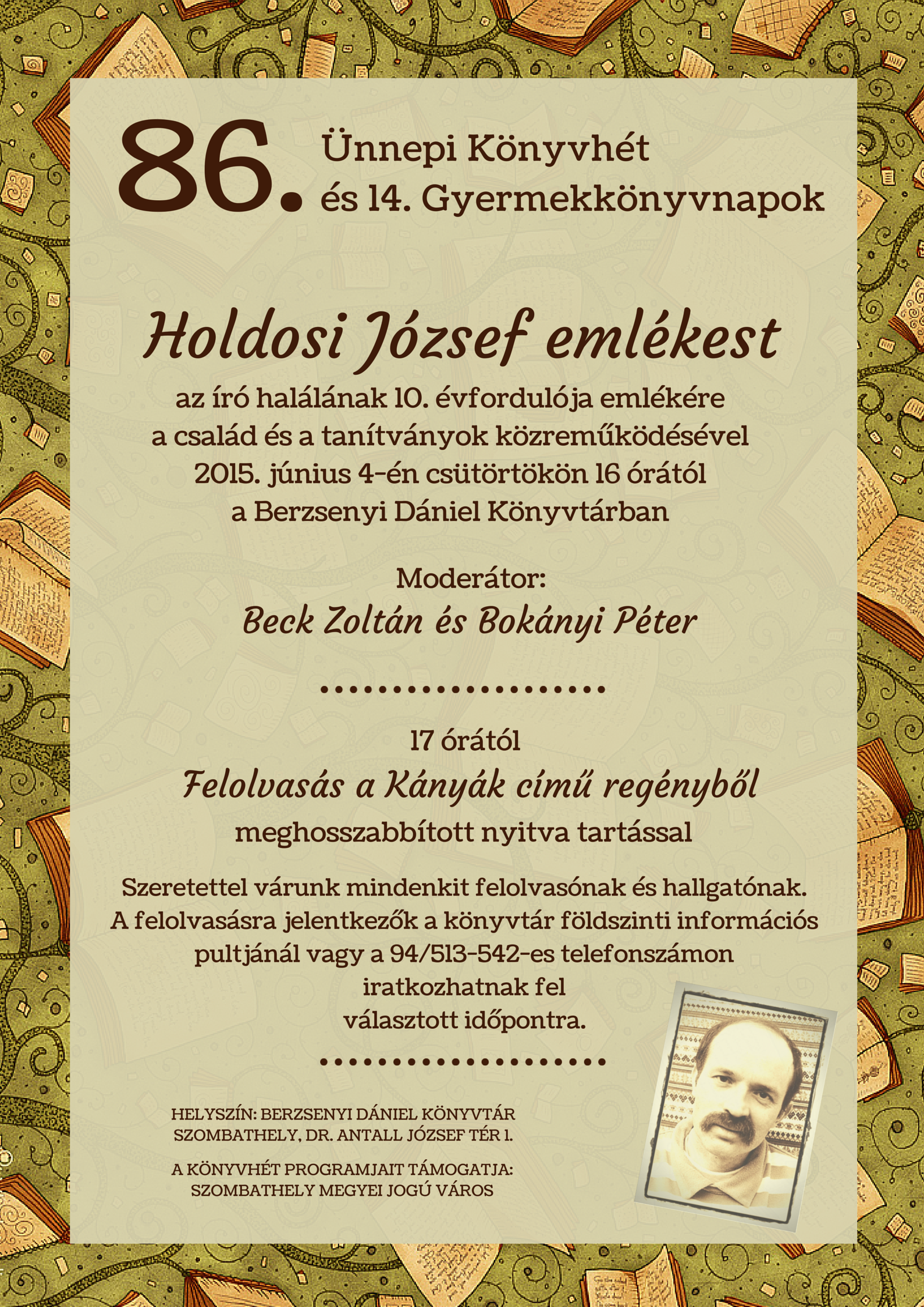 Felolvasás Holdosi József Kányák című regényéből meghosszabbított nyitva tartással |