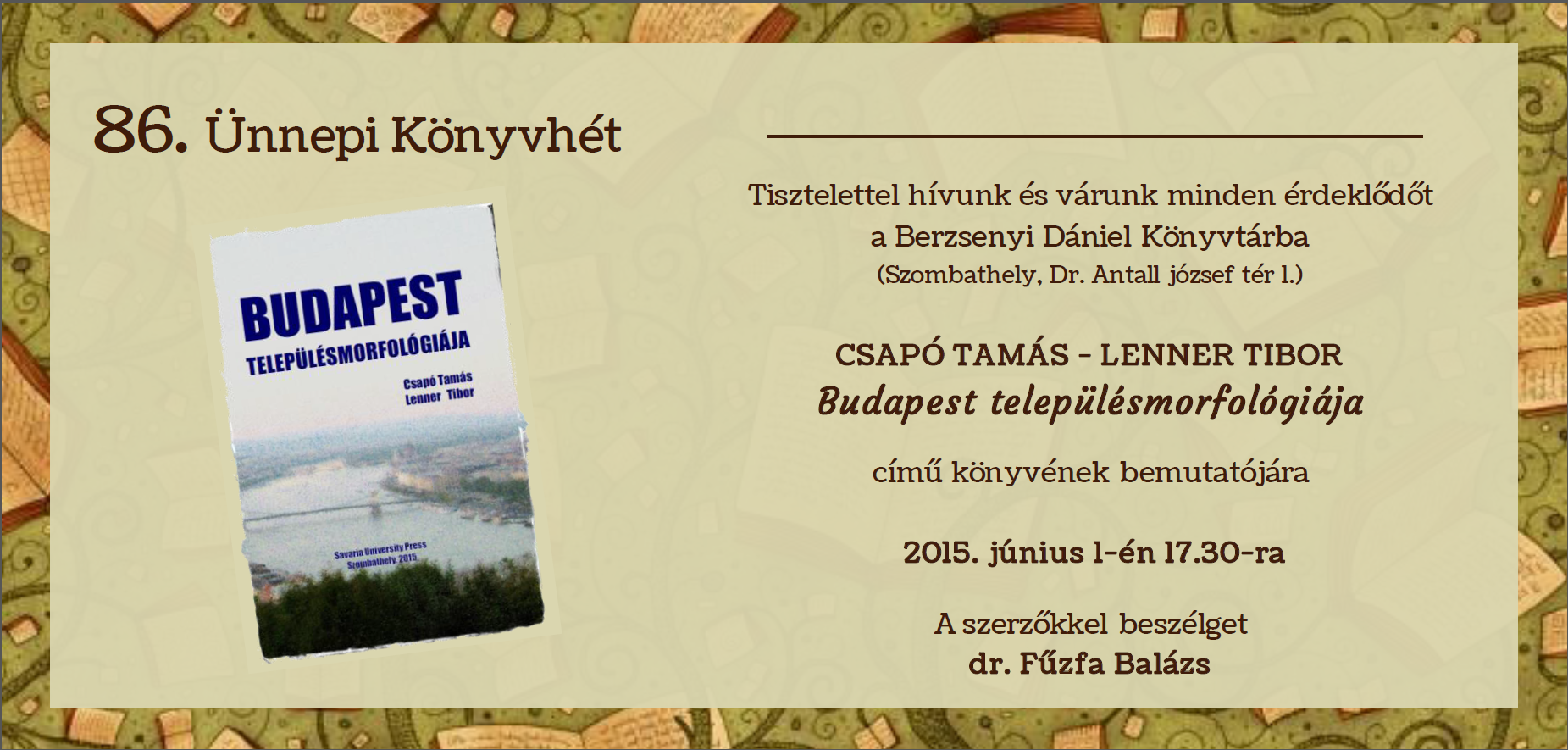 2015. június 3. szerda Helyszín: Berzsenyi Dániel Könyvtár, Szombathely, Dr. Antall József tér 1. |