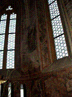 A szentély ablakmélyedése virágokkal, növényi ornamentikával díszített; felül van Veronika kendője Jézus képmásának lenyomatával.